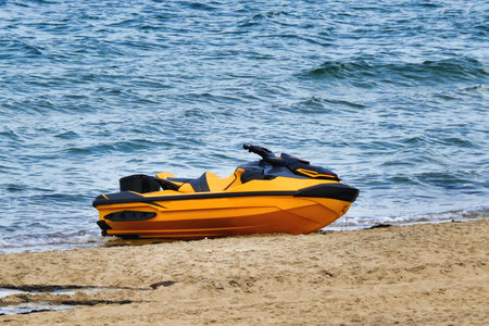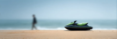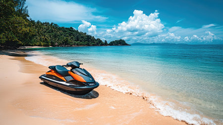Modern personal watercraft parked on a sandy beach with gentle ocean waves, offering a serene and inviting scene for watersports enthusiasts