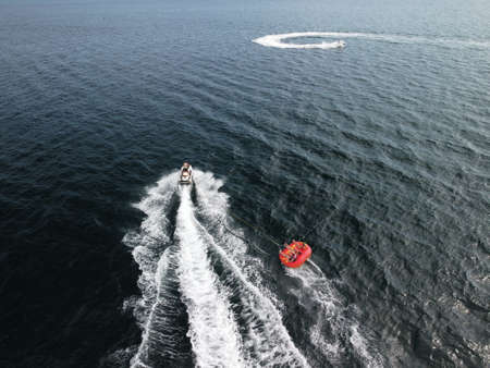 Aerial top view of jet ski or boat drawing a shape on sea ocean turquoise water. Adventure outdoor extreme recreation activity in summer season. Lifestyle