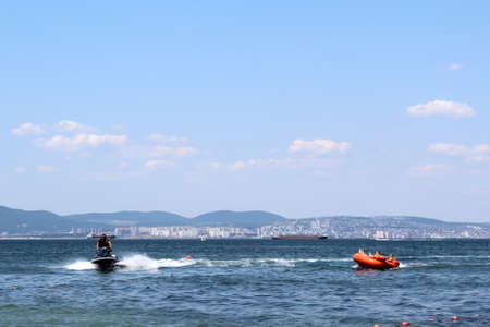 Inflatable attraction. Happy people are going to swim on an air mattress behind a jet ski. Tourists ride the inflatable watercraft boat. Jet ski skating people on a large Inflatable raft