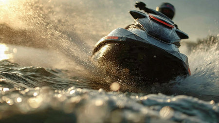 Jet skiing adventure at sunset on clear waters with vibrant colors and waves splashing