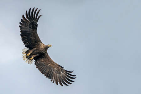 White Tailed Eagle (Haliaeetus albicilla) in flight. Also known as the ern, erne, gray eagle, Eurasian sea eagle and white-tailed sea-eagle. Wings Spread. Poland, Europe. Birds of prey.