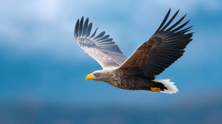 Majestic bald eagle in flight against blue sky and clouds