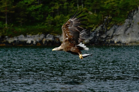 White-tailed eagle in flight, eagle with a fish which has been just plucked from the water, Norway,Haliaeetus albicilla, eagle with a fish flies over a sea, majestic sea eagle, wildlife scene