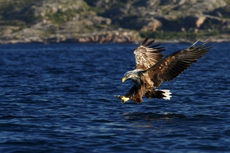 A white-tailed sea eagle, also known as the Eurasian sea eagle (Haliaeetus albicilla), flies low over blue water carrying a fish in its talons in Norway.