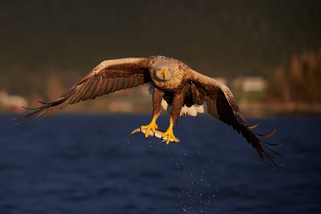 White-tailed eagle in flight hunting fish from sea,Norway,Haliaeetus albicilla, majestic sea eagle with big claws aiming to catch fish from water surface, wildlife scene