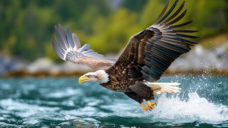 An American Bald Eagle is seen elegantly swooping down to land on the surface of a body of water, showing its powerful wings and sharp talons in action.
