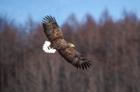 White-tailed eagle in flight, eagle flying against blue sky with clouds in Hokkaido, Japan, silhouette of eagle at sunrise, majestic sea eagle, wallpaper, bird isolated silhouette, birding in Asia