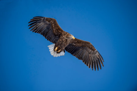 White-tailed eagle in flight on background blue sky. Japan. Hakkaydo. Shiretoko Peninsula. Shiretoko National Park. An excellent illustration.