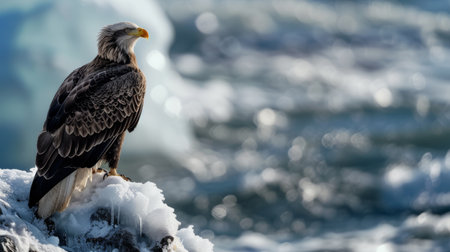 An eagle standing proudly on a rocky outcrop, with a vast ocean in the background