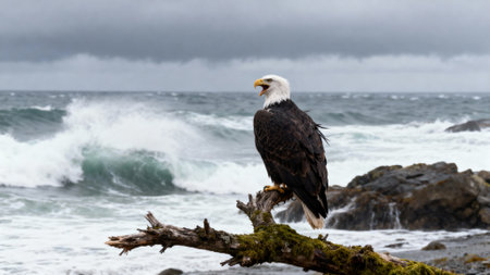 An impressive bald eagle sits on a mossy log, with the ocean waves crashing behind it on a cloudy day