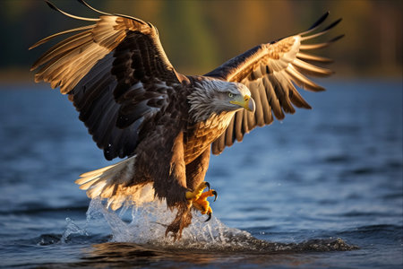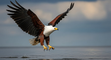 Majestic african fish eagle in flight over water capturing prey