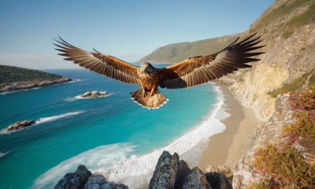 A majestic sea eagle soaring high above the rugged coastline