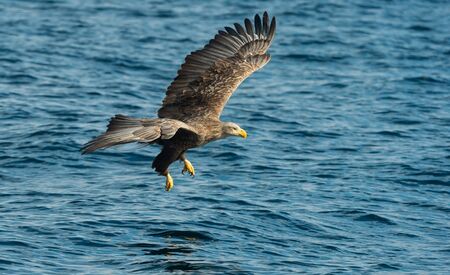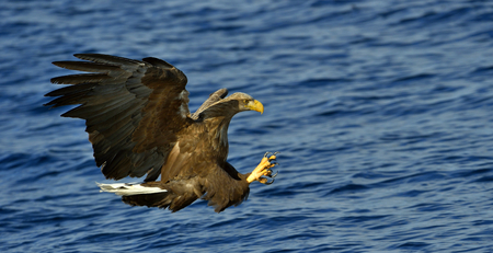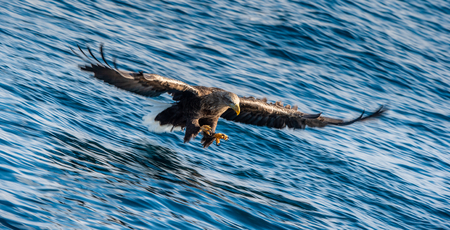 Adult White-tailed eagle fishing. Blue Ocean Background. Scientific name: Haliaeetus albicilla, also known as the ern, erne, gray eagle, Eurasian sea eagle and white-tailed sea-eagle. Natural habitat