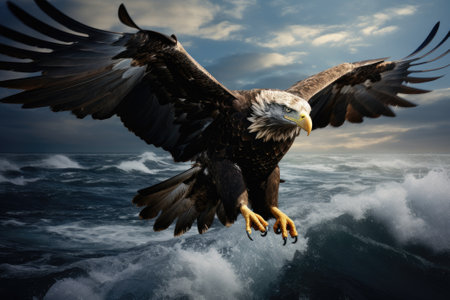 A magnificent bald eagle soars above the ocean waves at sunset.