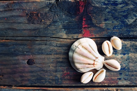 Sea shells on a dark old plank background