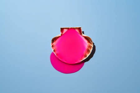 Scallop seashell with pink filling spilling on blue background. Minimalistic concept for female health and problems