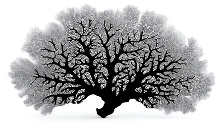 An artistic illustration features a black tree silhouette against a white backdrop. The composition showcases detailed branching patterns and textures. This image provides a clean aesthetic, ideal for various design applications, potentially for print or digital media projects, and could be utilized editorially.