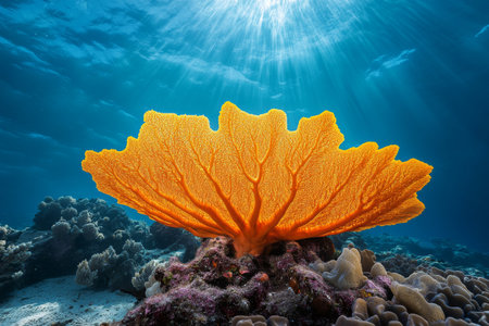 A beautiful orange gorgonian coral stands tall on the seabed, surrounded by schools of small fish, showcasing a healthy and diverse marine environment. perfect for nature, ocean, or conservation themes.
