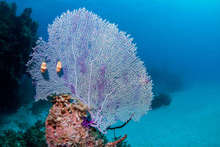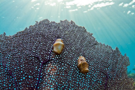 Fan coral with two Flamingo Tongues on a coral reef in the Bahamas