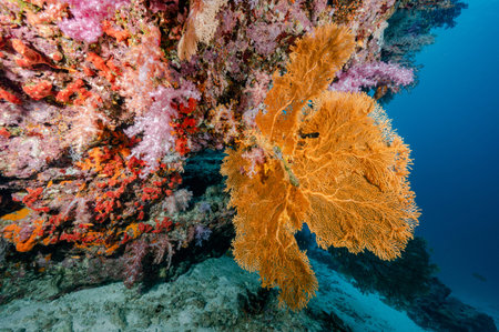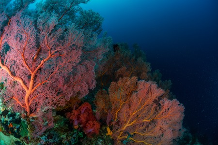 Giant Branching Gorgonian Sea Fan coral (Seafan) with colorful soft coral reef and marine life at North Andaman, a famous scuba diving dive site and exotic underwater landscape in Thailand.