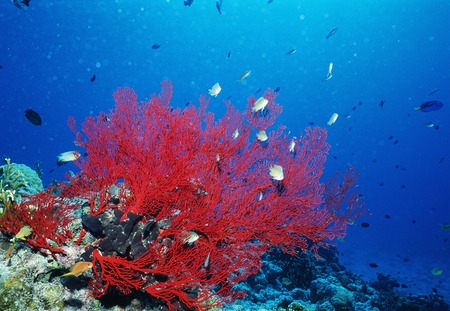 Gorgonia on a reef near Daedalus reef in the Red Sea. Large red gorgonians found on reefs. Gorgonias found on coral reefs. Red Sea, Egypt