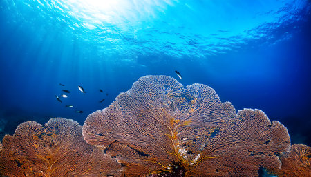 The Enchanting Dance: A Beautiful Gorgonia Sea Fan, Delicate Coral Reef, and Silhouettes of Divers