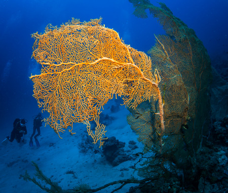 Coral reef with gorgonian on the bottom of tropical sea on blue water background