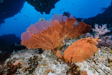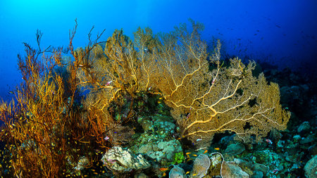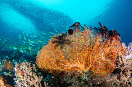 Branching Gorgonian Sea Fan coral or Giant Seafan with marine life at North Andaman, a famous scuba diving dive site and exotic underwater landscape in Thailand.
