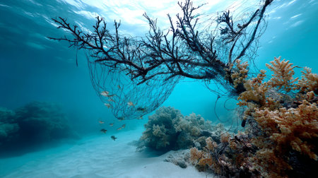 moody editorial shot of diver touching dead coral beside vibrant patch, high contrast lighting, environmental message, Generative AI