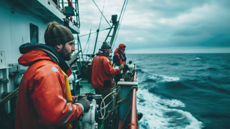 Fishermen work diligently under stormy skies, handling ropes and nets on a fishing vessel. The scene captures the essence of marine industry and teamwork while enduring challenging weather.
