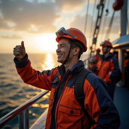 A lone worker wearing a safety helmet stands on a ship deck, gazing at the ocean waves. This scene highlights maritime safety and reflects a powerful connection with the open sea.