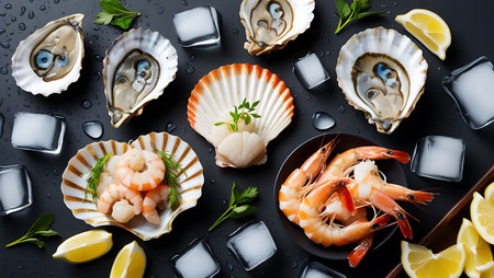 A luxurious seafood platter featuring fresh oysters, succulent shrimp, and delicate scallops arranged on a bed of ice with lemon wedges and herbs for garnish.