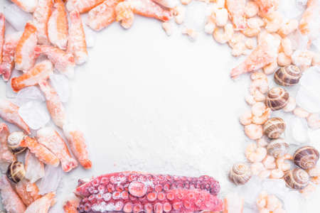 assortment of frozen seafood on ice cubes, shrimps, octopus, Babylonia areolata shellfish snails, langoustines, rich in iodine, antioxidants and vitamin, top view, copy space