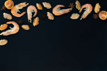 Seafood background. Top view of fresh raw shrimps, clams and prawns.