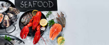 Assortment of fresh raw fish and seafood. Healthy and balanced diet or cooking concept. Top view, copy space, chalkboard. Panorama, banner