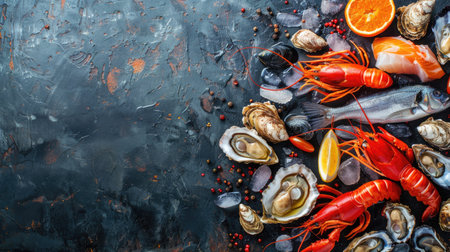 Vibrant seafood selection featuring fish, crustaceans, oysters, and mussels on a black stone background