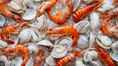 A stunning seafood display showcasing shrimp, clams, and mussels with vibrant colors, ideal for promoting fresh cuisine and culinary creativity in food photography.