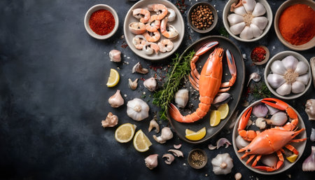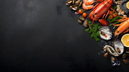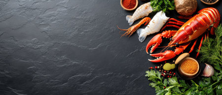 A black background with a variety of seafood and vegetables. The seafood includes shrimp, lobster, and fish. The vegetables include parsley, cilantro, and celery. Concept of abundance and freshness