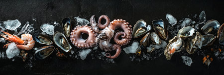 A stunning seafood platter featuring fresh octopus, shrimp, and dorado, arranged on black concrete with ice, evoking a sophisticated and inviting atmosphere, banner