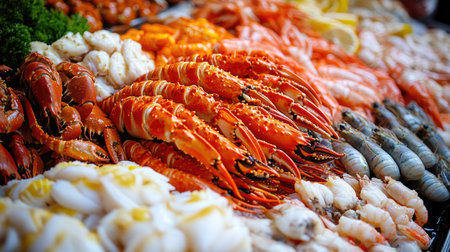 A vibrant display of fresh seafood at a bustling market, featuring an array of shrimp, lobster, and shellfish. Perfect for culinary inspiration.