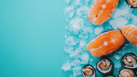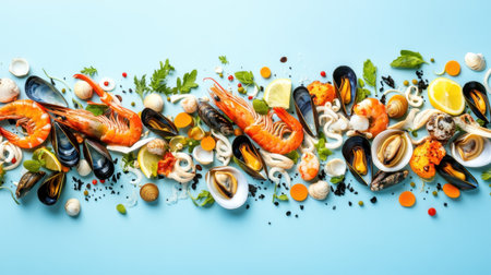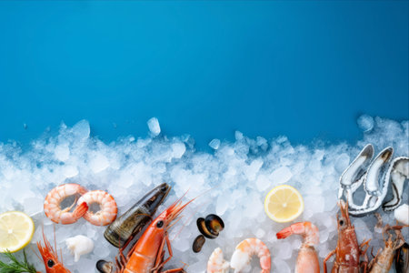 A beautiful display of various seafood items on a bright blue background, showcasing the freshness and diversity of marine life ideal for culinary inspirations and food photography.