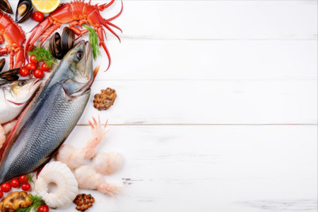 Under the Sea Delights: Fresh Fish and Seafood on a White Wooden Background