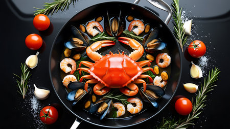 A mouthwatering seafood medley featuring a large crab, succulent shrimp, mussels, and garlic, cooked in a skillet and garnished with fresh rosemary and tomatoes.