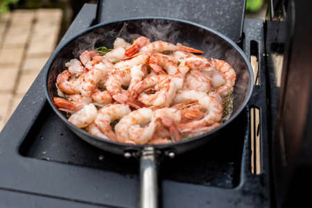 cooking seafood, frying shrimp in a pan, homemade food