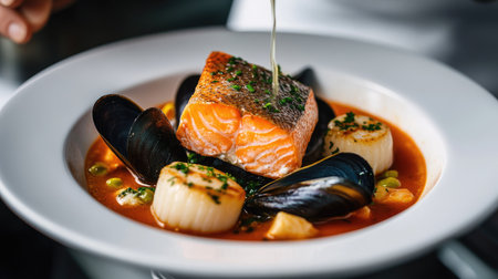Closeup of rich red bouillabaisse soup, featuring salmon, scallops, and mussels, pouring from a bowl into a white plate, capturing the essence of a gourmet seafood dish.