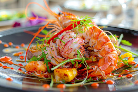 A detailed view of a gourmet seafood dish, prepared by a renowned chef.