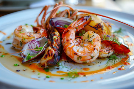 A close-up of a chef's special seafood dish. The plate is a canvas, with the seafood and accompanying garnishes creating a beautiful, appetizing picture
