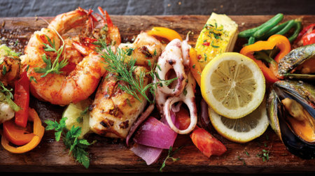 A beautiful seafood platter featuring grilled salmon, shrimp, and lobster, garnished with herbs and lemon. Perfect for festive occasions and gatherings.