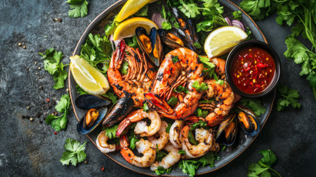 Delicious Seafood Platter of Grilled Fish, Shrimp, and Shellfish with Lemon slices and sauces. top view.
