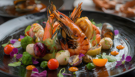 A close-up of a chef's special seafood dish. The plate is a work of art, with the seafood and accompanying garnishes creating a beautiful, appetizing picture